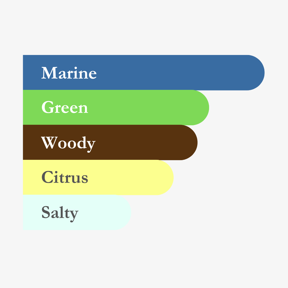A watery, salty composition that evokes the memory of a night by the ocean. Subtle citrus notes deliver a surge of freshness, while green and woody accords ensure impressive projection and long-lasting performance.